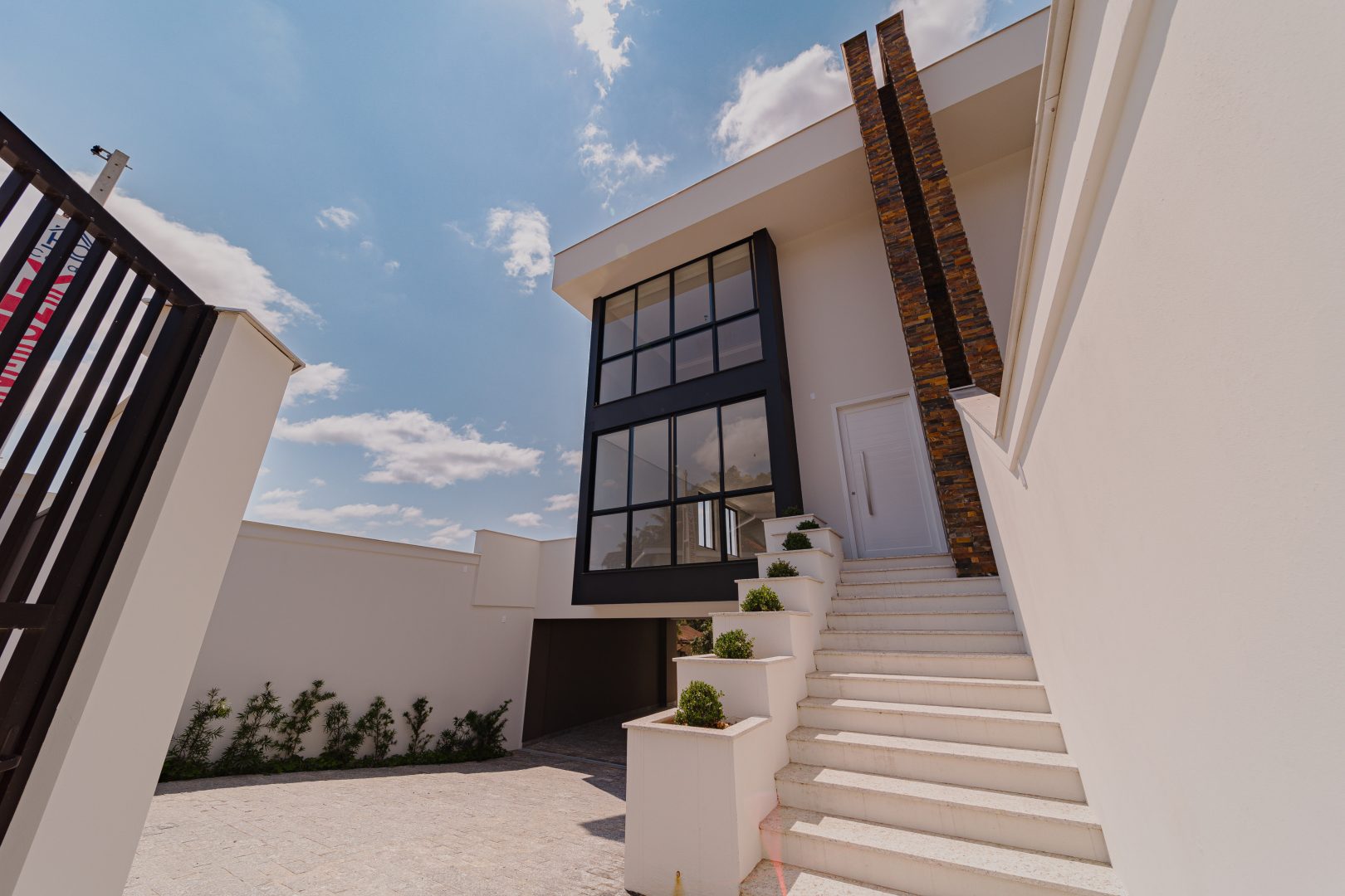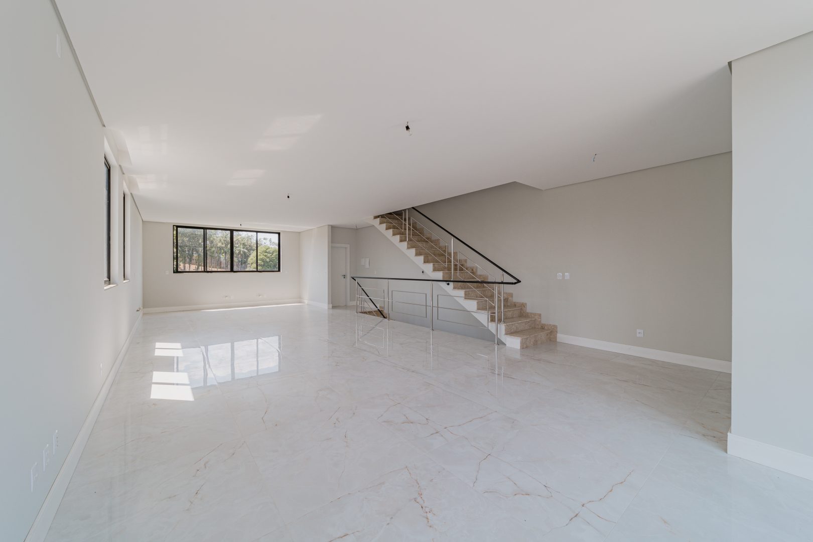 O pavimento acima contém hall, sala de estar, sala de jantar, cozinha e lavabo, formando um amplo espaço social em conceito aberto.